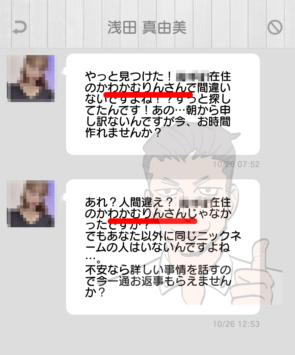 こんなふざけたプロフィールにガンガン返信を出してくる女性なんているはずないですから、写真もおそらく使いまわしだろうなということは感じていましたけど、念のために薄らとモザイクをかけていますww