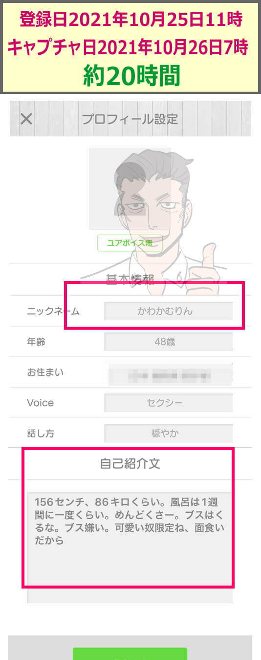 そして、怪しさ満載のこの出会い系アプリ、本当に会えるなんて僕の経験からしてみたら120%考えられませんから、あえてめちゃくちゃなプロフィールにしてみました。