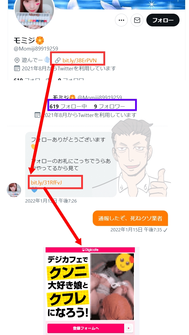 試しにDMを送ってみてください。出会い系サイトの誘導が来るはずです(笑)