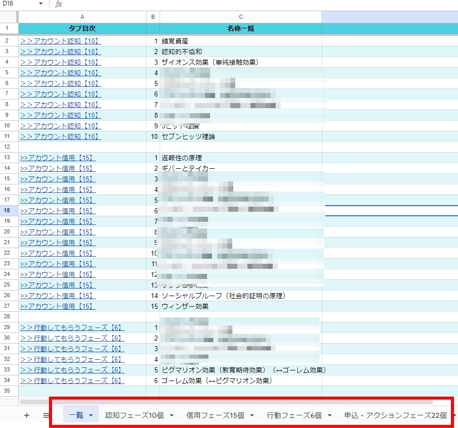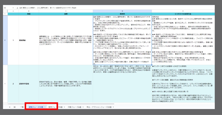 このスプレッドシートに書かれているWeb心理学やマーケット心理学をしっかりと理解しながら、局面局面で効率よく使って、信頼と実績を勝ち取ってください。