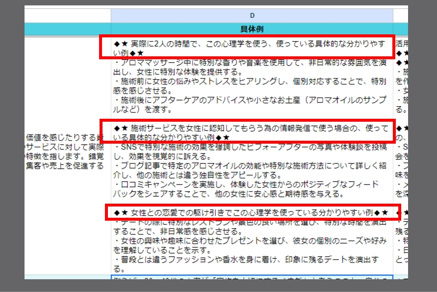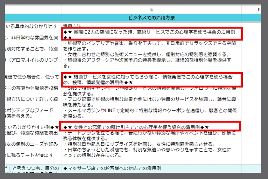例えば、アカウント認知のフェーズ(局面)において、 でいた心理学用語の説明、具体例、実際の集客や施術の女性に対する使い方などのヒントを分かりやすく書いています。